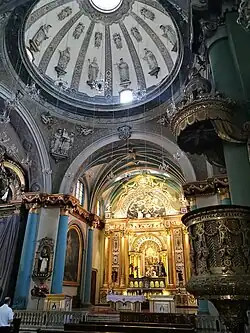 The altar is of neoclassical style with decoration in turquoise and gold.