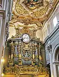 Today the central nave has an exquisite wooden lacunar ceiling carving, painting and gilding by Ferdinando Mosca da Pescocostanzo (1723-1727]), who also made the magnificent pipe organ. The ceiling was later painted by Girolamo Cenatiempo, pupil of Luca Giordano. The lateral naves include many chapels formed in octagonal cupolas.