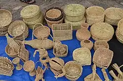 Basketry made with reeds and rushes is done in various regions in the state of Oaxaca, such as the Central Valleys, the Miahuatlán Valley, the Mixtec region and Tehuantepec, mostly baskets for the transport of merchandise.[4] Most of these wares originally were for carrying merchandise to market, along with petates and tenates. From the mid 1980s, Oaxacan basketry, especially in the Central Valleys as incorporated Asian elements into their designs. Amador Martinez went to China to learn bamboo basketry. When he returned, he taught other artisans what he had learned. The new forms have also been incorporated in the basketry workshops of the prisons in Tlacolula and Ocotlán. The new forms and decorations have had steady levels of increasing acceptance in the region.[1]