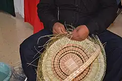 There are several main techniques associated with the making of basketry in Mexico, coils, braiding. weaving and twisting.[2][1] The techniques used vary widely over the country as it depends on the available raw materials. Three dimensional object have three parts, a center, from which the process begins, walls (sides) and edges. The oldest technique is the coil, where fibers are pressed together, coiled onto themselves and held in place by sewing them. Vestiges of this types have been found and dated archeologically, with the best-known example today being the corita baskets of the Seri people. One other technique is the twisting of fibers on themselves. This is combined with weaving in mixed technique pieces. Woven pieces start with two or more cross pieces and the thinner pieces woven over them. It is generally used to create containers, carrying pieces and mats and is the most versatile. The braiding technique is most commonly used for the making of hats.[1][4]