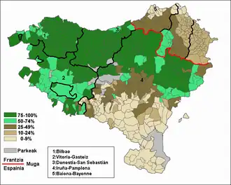 Percentage of fluent speakers of Basque (areas where Basque is not spoken are included within the 0–4% interval)