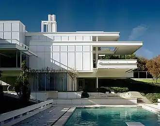 The home is an extravagant white multilevel structure which can be classified as Modern architecture.[3] The single-family home was designed by Paul Rudolph for Sid and Anne Bass in 1966. Sid Bass was a billionaire who made his fortune in the oil business. Sid Bass commissioned the home while he was a young man. The grounds included a swimming pool and a courtyard for vehicles.[2] The entrance is found at the uppermost level of the home. The driveway extends out of the east portion of the home and leads to the entrance.[4] Above the entrance there is the dramatic feature of a horizontal 40 feet (12 m) cantilevered overhang. The architect, Paul Rudolph, thought that the Bass house was the best home he had designed.[2]