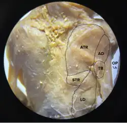 The labeled muscle groups of a bat. Abbreviations are as follows; ATR: acromiotrapezius, AD: acromiodeltoideus, TB: Triceps brachii, OP: occipito-pollicalis, LD: latissimus dorsi. Follow [15]