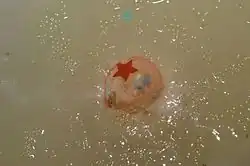 A bath bomb or bath fizzie is a toiletry item used in the bath. It was invented and patented in 1989 by Mo Constantine, co-founder of Lush Cosmetics.[1] It is a compacted mixture of wet and dry ingredients molded into any of several shapes and then dried. Bath water effervesces at the surface of a bath bomb immersed within it, with attendant dispersion of such ingredients as essential oil, moisturizer, fragrance, or colorant.