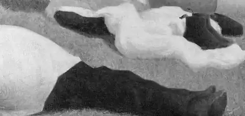 X-ray imaging of the Bathers has revealed that some components of the composition were altered as Seurat’s work on the canvas progressed, while other components were probably not in the painting at all, as he first painted it. The two reclining figures—one at the front of the image, the other with the straw hat toward the rear—are revealed by the X-ray image to have been among the later concerns for Seurat. The reclining man at the front has had the position of his legs moved to a position more horizontal than that in which they were when first painted. The reclining figure toward the rear is not visible in the X-ray image at all, showing he is a late addition. His posture reflects the altered position of the man in the foreground, raising the suggestion that he was painted in as a compositional response to the alteration made to the man at the front. The skiff and the ferry boat with the tricolor, and the pointillistically applied spots at various locations in the lower mid-section of the painting, are also absent in the X-ray image. A contentious theory suggests that these elements were added by Seurat as a means of making a connection between the Bathers and A Sunday Afternoon on the Island of La Grande Jatte. In spite of their remoteness in the middle distance, the motifs and the seated figures on the boat are present in the later painting, and the ferry boat indeed traverses the river between the Courbevoie river-bank and the île de la Grande Jatte itself. The late additions in Bathers bring for the first time a note of vitality to the serene picture in keeping with the more "sociable" climate of A Sunday Afternoon on the Island of La Grande Jatte.[41]