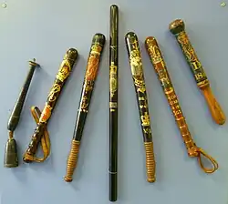 A straight, fixed-length baton (also commonly referred to as a "straightstick") is the oldest and simplest police baton design, known as far back as ancient Egypt.[5] It consists of little more than a long cylinder with a molded, turned or wrapped grip, usually with a slightly thicker or tapering shaft and rounded tip. They are often made of hardwood, but in modern times are available in other materials such as aluminium, acrylic, and dense plastics and rubber. They range in size from short clubs less than 30 cm (1 ft) in length to 90-centimetre-long (3 ft) "riot batons" commonly used in civil disturbances or by officers mounted on horseback.