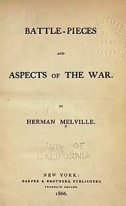 Battle-Pieces and Aspects of the War is the first book of poetry of the American author Herman Melville. Published by Harper & Brothers of New York in 1866, the volume is dedicated "To the Memory of the Three Hundred Thousand Who in the War For the Maintenance of the Union Fell Devotedly Under the Flag of Their Fathers" and its 72 poems deal with the battles and personalities of the American Civil War and their aftermath. Also included are Notes and a Supplement in prose in which Melville sets forth his thoughts on how the Post-war Reconstruction should be carried out.