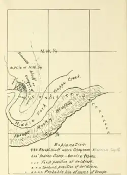 Before daybreak, Henely commanded Sergeant George Kitchen, along with ten other men of the party, to round up a group of Indian horses grazing on the nearby plateau, and to kill the herders.[3]:114 Another group led by Cpl. Edward C. Sharpless was to protect their supplies. Henely was left with 25 soldiers plus Wheeler and the three hunters to attack the Indians head on.[3]:114 When daylight began to break, an Indian herder spotted the company and ran to warn the Indian camp.[8]:104-105 Henely immediately commanded his men to advance, although the marshy banks made it difficult to cross the river which separated the Cheyenne from the company, and the men lost a carbine and a pistol in the process.[4]:69