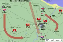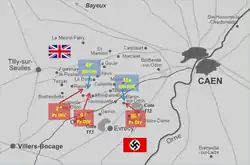 Operation Perch was intended to create the threat of a British break-out to the south-east of Caen by XXX Corps, with the 50th (Northumbrian) Infantry Division capturing the road to Tilly-sur-Seulles.[41] The 7th Armoured Division would then spearhead the advance to Mont Pinçon.[42][43] On 9 June, Montgomery ordered that Caen be taken by a pincer movement.[44] The eastern arm of the attack would consist of I Corps with the 51st (Highland) Infantry Division, which was to cross into the Orne bridgehead and attack southwards to Cagny, 6 mi (9.7 km) south-east of Caen. XXX Corps would form the western arm of the pincer; the 7th Armoured Division would advance to the south-east and cross the Odon River, to capture Évrecy and Hill 112.[45][46] XXX Corps attacked Tilly-sur-Seulles against the Panzer Lehr Division and part of the 12th SS Panzer Division, which held Tilly despite many casualties on both sides.[47][48][49]