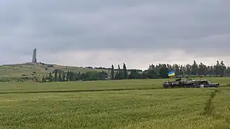 Savur-Mohyla is a strategically important hill near the Russia–Ukraine border, and overlooks the villages of Dmytrivka and Marynivka. DPR-affiliated insurgents used the hill to shell the government-controlled village of Marynivka on 16 July, amidst an offensive by the insurgents on that village. In response, the Air Force of Ukraine attacked insurgents positions on the hill, whilst the insurgents tried to repel this attack by firing anti-aircraft guns at Air Force aeroplanes. Government forces that were encircled near the hill tried to break out of encirclement and rout the insurgents on it. Ukrainian fighter jets were shot down near the hill on 23 July. A report by the Ukrainian government said that the shoot-downs were caused by missiles fired from Russia. Insurgent commander Igor Girkin said that DPR fighters shot down one of the planes, and that the pilot ejected.[17] Ukrainian forces said that they retook the hill on 28 July. As a result, a corridor was created to resupply units that were trapped nearby.[18] Intense fighting in the area continued on 31 July.[19] Insurgents attacked Ukrainian positions on the hill from the nearby city of Snizhne on 5 August.[20] A spokesman for the National Security and Defence Council of Ukraine said on 6 August that Ukrainian forces on Savur-Mohyla had come into contact with pro-Russian insurgents twenty-five times in the past twenty-four hours.[21] Amidst a wide counter-offensive by insurgents forces across the Donbas on 26 August, Savur-Mohyla was recaptured by DPR-affiliated forces.[22][23]