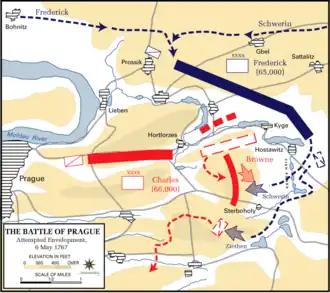 King Frederick's exact whereabouts throughout the battle are, however, a matter of debate. The few recorded sightings of the King indicate he spent virtually the entire battle on the southern part of the field.[5] By King Frederick's own account, he claimed to have fallen ill with stomach pains as a means of explaining his frequent absences and seemingly deferred to Schwerin both on matters of reconnaissance and when the field marshal urged the necessity of an expedient attack at Sterbohol, a crucial village in the immediate vicinity of Prague, at the very onset of the battle.[6][7] As such, Schwerin's leadership and the independent initiative of regimental commanders following the field marshal's untimely demise should be hailed as chiefly contributing to the battle's victorious conclusion.[8]
