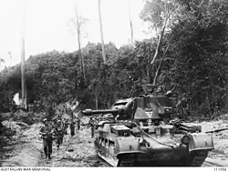 The operation was designated "Operation Oboe Two" by the Allies, who assigned 33,000 personnel.[23] The main ground forces, amounting to 21,000 personnel, were drawn from Major General Edward Milford's 7th Division, a veteran Second Australian Imperial Force formation consisting of three infantry brigades – the 18th, 21st and 25th – along with supporting artillery, armour, engineer and logistics support units. The 7th Division had seen action earlier in the war in the Middle East and in New Guinea, but had been resting on the Atherton Tablelands in Queensland when they were assigned to the operation.[1] The division's formation and unit-level command teams were all very experienced, but due to the high turn over of personnel that had occurred in the Australian Army in 1943–1944, many of its more junior personnel had not been in action before.[35] Tank support was provided by the 1st Armoured Regiment, equipped with Matilda tanks.[36] Naval support was drawn from the US 7th Fleet under Admiral Thomas Kinkaid,[37] while air support came from the Australian First Tactical Air Force,[38] and the US Thirteenth Air Force.[39] Three US Navy escort carriers were also assigned to provide fighter support as the airstrip at Tarakan had not been made operational in time, and weather conditions hampered the provision of fighter support from the Philippines.[40] A small number of Dutch KNIL troops, were also assigned to the operation,[41] amounting to a company from the 1st Infantry Battalion (KNIL).[36]