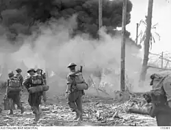 Meanwhile, the assault troops aboard nine tank landing ships (LSTs) made for the transport area where they were transferred to smaller landing craft, including Alligator tracked landing vehicles (LVTs), DUKWs and LCVPs.[50][51] These craft were crewed by US personnel, mainly from the 672nd and 727th Amphibian Tractor Battalions and the 593rd Engineer Boat and Shore Regiment.[36][52] Under the cover of the bombardment they began their run to the shore in several waves. When they were 1,300 yards (1,200 m) from the shore, the naval bombardment ceased.[49] The ramps came down on the landing craft as they hit the beaches just before 9:00 am. The landing was carried out on a two-brigade front. Brigadier Frederick Chilton's 18th Brigade landed two battalions (the 2/10th and 2/12th) on the left at Red and Yellow Beaches, while one battalion (the 2/27th Battalion) from Brigadier Ivan Dougherty's 21st Brigade landed on the right at Green Beach. The division's third brigade (the 25th) remained embarked initially to act as a floating reserve.[53][54] The assaulting troops were landed at the wrong place due to obscuration of key features ashore as a result of the pre-landing bombardment, and a failure to clear all of the beach obstacles.[55] As a result two of the three assault battalions landed too far left,[56] and troops from each battalion became mixed up with others, causing some confusion. Despite this, the landing was opposed only by a small volume of fire, and within 15 to 20 minutes the assault troops had established a beachhead.[27][26] The landing force suffered no casualties during this first part of the operation.[55]