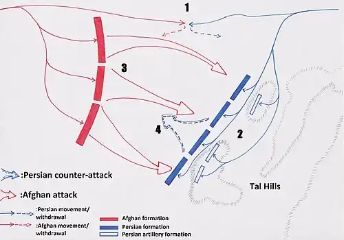 A rearguard of a few thousand mounted troops covered Nader's ongoing deployment to the left, on the Tal hills. In a break with conventional deployment patterns in oriental armies of this period Nader placed his artillery pieces behind his line infantry, where from their elevated positions on the high ground they overlooked the compact formations of Persian Jazāyerchi (musketeers) at the base of the hills as well as the valley in front of them.[3] The Afghan left which had come into contact with the Persian rearguard and instead of pursuing them fell back in line with the rest of Ashraf's army when the rearguard was withdrawn. Ashraf gave the order for an all out charge driving his cavalry army of 40,000 riders towards the Persians whom were now awaiting at the foot of the Tal hills. The terrifying horde of Afghan riders charged forward with incredible speed and impetus.