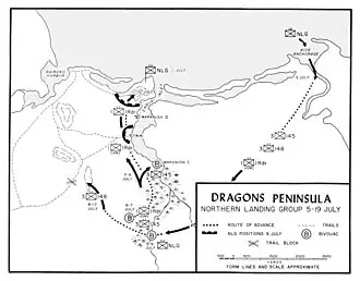 The task of landing around Bairoko was given to the Northern Landing Group, under the command of Colonel Harry B. Liversedge.[10][11] This force consisted of one battalion of U.S. Marine Raiders from the 1st Marine Raider Regiment (the 1st Battalion),[12] supported by two United States Army infantry battalions (the 3rd Battalion, 145th Infantry Regiment and the 3rd Battalion, 148th Infantry Regiment).[13][14] This force was organized to facilitate quick movement through the jungle. No artillery was assigned to the force; instead fire support would be provided by mortars and machine guns.[15][16] Additionally, only three days of rations were carried by the troops, as US commanders intended upon resupplying over the shore at the small port of Enogai on the Dragons Peninsula, after advancing from the landing beach around the Rice Anchorage.[17]