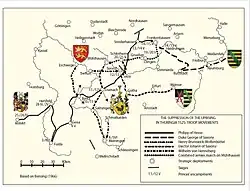 On April 29, 1525, the struggles in and around Frankenhausen had culminated into an open revolt.[1] Large parts of the citizenry joined the uprising, occupied the town hall, and stormed the castle of the Counts of Schwarzburg. In the following days, a rising number of insurgents gathered around the town, and when Müntzer arrived with 300 fighters from Mühlhausen on May 11, several thousand peasants of the surrounding Thuringian and Saxon estates camped in the fields and pastures. Philip of Hesse and his father-in-law George of Saxony had originally targeted Mühlhausen as their strategic objective but, when news arrived that Müntzer left with a troop for Frankenhausen, they changed their march route and directed their Landsknecht troops toward Frankenhausen.[2]