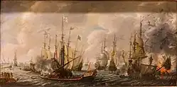 Van Heemskerk left some of his ships at the bay entrance to prevent the escape of any Spanish ships. Twenty from the Dutch fleet were ordered to focus on the Spanish galleons while the rest attacked the smaller vessels.[2] Van Heemskerk was killed during the first approach on the Spanish flagship as a cannonball severed his leg. The Dutch then doubled up on the galleons and a few of the galleons caught fire. One exploded due to a shot that penetrated its powder magazine. The Dutch captured the Spanish flagship but let it go adrift.