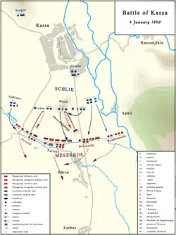 The Battle of Kassa was a battle in the Hungarian Revolution of 1848, fought on 4 January 1849 between Austria and Hungarian Revolutionary Army during the Winter Campaign of the Hungarian War of independence of 1848-1849. The Austrians were led by Lieutenant General Franz Schlik, while the Hungarians were led by General Lázár Mészáros. While the Austrian main army led by Field Marshal Alfred I, Prince of Windisch-Grätz was attacking Hungary from the West, Schlik's corps invaded Northern Hungary. The Hungarian Upper Tisza corps led by the Minister of War Lázár Mészáros tried to stop Schlik's corps, but he was defeated at Kassa. After this battle Colonel György Klapka, who will be more successful than Mészáros. On 9 January Kossuth appointed Colonel György Klapka to replace Mészáros.