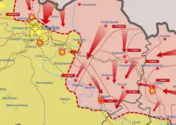 On 12 June, Amnesty International claimed it found the evidence of widespread use of widely-banned cluster munitions by Russia, such as 9N210/9N235 cluster bombs, and "scatterable" munitions that eject small mines that explode later in timed intervals.[49] In September, the Ukrainian military launched a major counteroffensive into territories that were still under Russian control in Kharkiv Oblast.[50] As a result, Russian forces located close to the city were pushed back, resulting in significantly reduced pressure on Kharkiv.[51]
