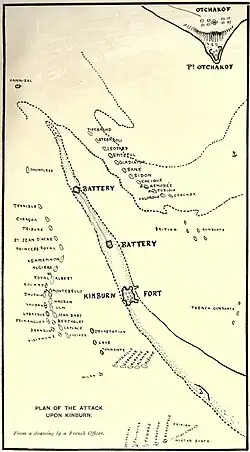 The fortress was located on the Kinburn Spit, at the extreme western end of the Kinburn Peninsula, and consisted of three separate fortifications. The primary fort, built of stone, square, and equipped with bastions, held 50 guns, some of which were mounted in protective casemates; the rest were in en barbette mountings, firing over the parapets. Two smaller fortresses were located further down the spit, mounting ten and eleven guns, respectively. The first was a small stone fort, while the second was a simple sand earthwork. The forts were armed only with medium and smaller calibre guns, the largest guns being 24-pounders. Major General Maxim Kokhanovitch commanded the garrison of 1,500 men, most of whom were stationed in the main fort. Across the estuary was Fort Nikolaev in the town of Ochakov with fifteen more guns, but these were too far away to play a role in the battle.[5][6]