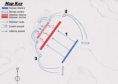 The Persian Jazāyerchi, after two hours of continuous musketry directly charged into the janissaries ranks. With impeccable timing Nader now released two contingents of cavalry, each 15,000 strong with Haji Beg in command of the right and himself in command of the left contingent, he manoeuvred around the Ottoman line and caught it in a double-envelopment.[8]