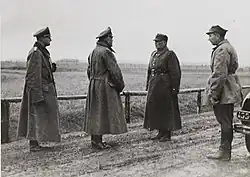 To the south, armies stationed around cities such as Kraków and Małopolska (lesser Poland) were defeated by the Wehrmacht Army Group South before being able to enter the San River line, thus preventing any coordinated defense formations in the region.[9] During these events, Marshal Edward Rydz-Śmigły served as the Commander-in-Chief of the Polish Armed Forces during the campaign, while General Franciszek Kleeberg, who commanded Army Area IX and later organized the Independent Operational Group Polesie, was responsible for the defense of the eastern front between Pińsk and Brześć.[10][11]