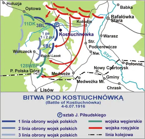 The Battle of Kostiuchnówka was a World War I battle that took place July 4–7, 1916, near the village of Kostiuchnówka (Kostyukhnivka) and the Styr River in the Volhynia region of modern Ukraine, then part of the Russian Empire. It was a major clash between the Russian Army and the Polish Legions (part of the Austro-Hungarian Army) during the opening phase of the Brusilov Offensive.