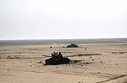 The Marines were assisted by the U.S. Army 2nd Armored Division's Tiger Brigade which was spearheaded by the 3-41 Infantry's Straight and Stalwart Battalion Task Force. The 2nd Armored Division's 3-41 Straight and Stalwart Battalion Task Force and the 1-3 Field Artillery Bn destroyed a large number of enemy vehicles and captured over 1,000 prisoners during combat operations. The 1st Tiger Brigade claims 181 destroyed or captured enemy tanks, 148 APCs, 40 artillery pieces, 27 AA emplacements, 263 Iraqi dead and 4,051 captured after 100 hours of combat.[21] The 2nd Marine Division lost 9 M60A1 tanks breaching the minefield.[6] One M1A1 tank, belonging to the 2nd Armored Division's Tiger Brigade, was also damaged by a landmine.[5] A pre planned counterattack by the 8th Mechanized Brigade of the Iraqi 3rd Armored Division attacked M1A1 tanks in the 2nd Marine Division's sector and was destroyed without loss, while the Marine 8th Tank Battalion destroyed other Iraqi tanks.[22] The Marine 3rd Tank Battalion destroyed an unknown number of Iraqi T-62 tanks around Al Jaber Airfield.[14] On the second day of the U.S. advance a platoon from the Marine 8th Battalion destroyed 13 Iraqi tanks in a battle near a defensive position known as the Ice Tray.[23] Marine and Navy air power then inflicted heavy casualties on retreating Iraqi forces leading north out of Kuwait City.[20] Later that night, some of the battles intensified as Marine forces surrounded the heavily defended Kuwait International Airport. U.S. Navy battleships offshore in the Persian Gulf pounded the airport hangars, terminals and other buildings, leaving them a shambles of twisted metal and blackened concrete in an effort to rout Iraqi forces from the field. Marine commanders said that cameras in remotely piloted aircraft that monitored the bombings showed Iraqis "literally jumping out of the tanks." After the Marines commandeered the critical airfield, Special Forces teams arrived to counter snipers and other pockets of resistance that remained entrenched around the large airport complex. While Marine and Special Forces personnel were actively securing the airfield, Air Force communications personnel arrived and setup tactical air traffic control and landing systems to replace systems damaged by retreating Iraqi forces.[24] Marines from Marine Air Traffic Squadron 38 established Approach ATC services and maintained service until civilian ATC returned.[25] The Marines lost 5 killed and 48 wounded in the three days of fighting, Marine officials said.[26] Marine M60A1 tankers had tallied impressive totals against the Iraqi armored forces. The 1st Tank Battalion claimed 50 Iraqi T-55 and T-62 tanks and 25 APCs. The 3rd Battalion claimed 57 T-55s and T-62s (plus 5 T-72s), 7 APCs, and 10 trucks. The 8th Battalion destroyed more than three dozen tanks and a number of other vehicles.[9]