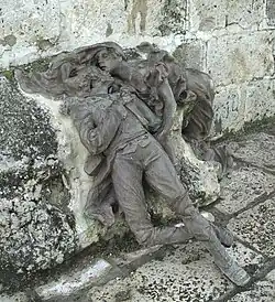 Blake reacted promptly to the menace to his position, stretching his line right to ward off encirclement and replying to the devastating French cannonades with his own batteries. Bessières' cavalry reserves then charged into the gap kept open by Mouton and tore into Blake's right flank, cracking his fragile force and driving it off the ridge in a panicked rout. Blake was saved from complete annihilation by the self-sacrifice of a lone battalion of regular troops from Navarre which stood its ground against the swarming cavalry, keeping the French at bay while Blake's half of the army made good its escape over the Sequillo river.[3]
