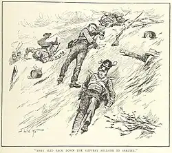 However, after the attack began only two columns, those under Carpenter and Ludlow, responded to Gillespie's signal to assault, which was given some hours earlier than was intended.[19][20] Under the cover of fire, pioneers twice swarmed up to the walls, only to be cut down by the enfilade fire of Bal Bhadra's cannons that were positioned along a large part the wall.[19][20] The garrison maintained a heavy bombardment from the walls, and heavy showers of arrows and of stones rained down on the assailants.[20] Women inside the fort also threw missiles, exposing themselves to British fire.[21] Gillespie's men fell back and on seeing this, he moved forward from the artillery line to personally rally his men.[19] With three fresh companies of the 53rd Regiment, he reached a spot within 30 yards (27 m) of the wicket, where, "as he was cheering the men, waving his hat in one hand, and his sword in the other," a Nepalese marksman shot him "through the heart, and he fell dead on the spot."[20][22] The General's death forced the British to temporarily cease their attack and withdraw.[22] Total British casualties for the day were 32 dead and 228 wounded, some of whom subsequently died.[fn 2][21][22]