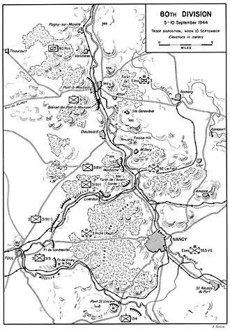 Instead, the 80th Infantry Division was assigned to secure three crossing sites across the Moselle: at Pont-à-Mousson with the 317th Infantry Regiment, Toul with the 319th Infantry Regiment, and a limited one at Marbache (48°48′05″N 06°06′17″E / 48.80139°N 6.10472°E) with the 318th Infantry Regiment. The 4th Armored Division would then sweep around from the northern Pont-à-Mousson to assault Nancy from the east, while infantry from Toul would attack from the west.