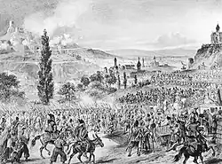 Meanwhile, Lazarev's cavalry fired a volley of artillery at the Dagestani cavalry assembled near the dilapidated tower, causing some confusion among the former, who began to move 'back and forth without any purpose'. Umma Khan, who was there, still managed to organize his mounted army and led it to strike at the rear of the Georgian column, attacking its left flank where the Georgian militia on foot, mostly without firearms, was located. With a swift attack, the Dagestani cavalry overturned the Georgian infantry and sent it into flight. The musketeer battalion, which had been adjoining the left flank of the Georgian column, was by that time already close to the Iori River, reaching it ‘no more than 50 paces’.[63] Seeing Umma Khan's cavalry rushing toward the Georgian militia, Guliakov immediately turned his battalion and, crossing the ditch, charged against the enemy. After his battalion fired a volley, the Dagestani cavalry broke away from the Georgian infantry. The final blow to Umma Khan's army was dealt by the Georgian cavalry under Prince Ioane, sending it into disorderly flight.[73]