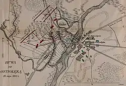 On the morning of 26 May, most of the Polish army was west of the Narew River except for General Tomasz Łubieński's 5th Infantry Division (part of the II Corps), and General Ludwik Bogusławski's 4th Line Infantry Regiment, which were still east of Ostrołęka.[8] Łubieński's orders from Ignacy Prądzyński was to "defend yourself through the day to come", despite facing Russian forces four times his size.[8] The danger, according to the commanding officer of the Polish Cavalry Brigade, General Karol Turno, was in being trapped and pushed into the river as occurred in the Battle of Berezina.[9] The Russian army made contact at 06:00 with the arrival of forces under General Georg von Nostitz, and the battle began at 09:00 when Friedrich von Berg arrived, with the Poles offering strong resistance, forcing Nostitz to wait for the arrival of the rest of Field Marshal Diebitsch's forces, which included Generals Nabokov, Lopukhin, Manderstierna and Shakhovskoy.[10] By 10:00, Łubieński was forced back to Ostrołęka on the Narew, with some protection from Prądzyński's guns and veterans located on the sandy hills to the west.[11] The Polish headquarters were moved to Kruki, further to the west, on the Omulew River, a tributary of the Narew[12]
