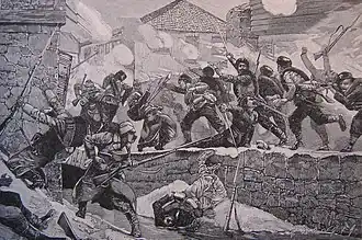 During the night of 27 November, the Serbs regrouped and at dawn managed to retake Pirot from the Bulgarians.[1] The column of Major Gudzhev attacked the Šumadija Division and the Bulgarians managed to push the Serbs to the river Temska. The retreat of the Šumadija Division forced the Drina Division to pull back as well and the Bulgarians pursued them. On the left flank, the Bulgarians were also successful. The Serbs managed to hold their position in the southern part of Pirot until the night.[1] Later the Bulgarians pushed the Serbs from the city and attacked Serbian army positions west of the town of Pirot.[5] The Serbians continued to hold a position to the south of the town till nightfall.