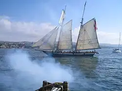 Polkinghorne reported that only two of his men were killed and eleven wounded, including himself.[11] American newspaper reports in Niles Register at first claimed that fifty Britons had been killed,[12] later reducing that claim to nineteen dead.[13] A review by British and American historians later put the British losses at two dead and eleven wounded with American losses as sixteen killed and wounded.[14] The battle lasted in between fifteen minutes and two hours according to various accounts. Captain Stafford later returned to Baltimore. He was treated well in captivity partly due to his good treatment towards British prisoners from his captured prizes. Lynx was taken into British service as Mosquidobit and was sold out of the Royal Navy in 1820. A replica of Lynx now spends its time on an educational mission sailing back and forth between the Great Lakes and Florida's Gulf Coast. Racer became Shelburne and Dolphin retained her name as Dolphin. It was difficult for the British to free Arab and though they eventually succeeded, the vessel was apparently badly damaged and was not commissioned for British service.[15]