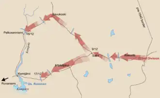Soviet troops pushed the Finns up to the Kemijoki river, but were unable to break through the Finnish defences on the river. The Soviet supply lines were now 145 kilometers long. The Finns took advantage of the overstretched Soviet position by launching attacks with ski troops on the Soviet lines of communications. One third of Soviet troops were occupied guarding them. On 13 January, the Soviet 9th Army ordered the 122nd Division to retreat to the Märkäjärvi village.[14]