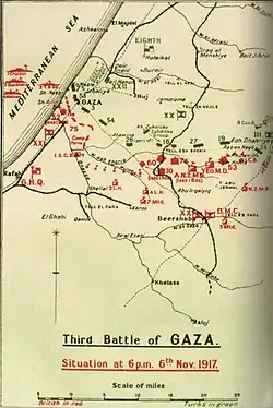 The 159th Brigade on the left was ordered to advance on Ain Kohle, but could not move forward. Several urgent requests were made during the day for a mobile reserve of a brigade or a regiment, but they were denied by Chauvel, who could not spare the reinforcements.[113] Although the attack by the 53rd (Welsh) Division had been very confused, suffering a "bloody defeat" instead of a "conquest", the 19th Division was stopped from moving back to reinforce Tel esh Sheria. The continuing threat of an attack up the road to the headquarters of the Seventh Army at Hebron and on to Jerusalem, was maintained by the repeated attacks on Tel el Khuweilfe by the 53rd (Welsh) Division. By the end of the day, the Ottoman defenders had succeeded in defeating the British infantry attacks on Tel el Khuweilfe, and continued to hold Tel esh Sheria, but they had begun to evacuate Gaza.[118] At nightfall, Chauvel issued orders for the Anzac and Australian Mounted Divisions to begin their advance northwards via Sheria towards Jemmameh and Huj, while Barrow commanding the Yeomanry Mounted Division was to take command of the force at Tel el Khuweilfe, including the 53rd (Welsh) Division.[107]