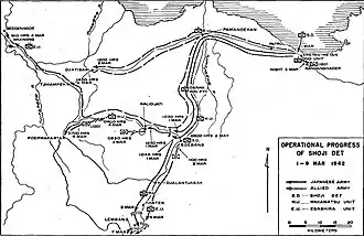 The failed counteroffensive had exhausted Allied reserves, and the "West Group" of the Allied forces (including one KNIL infantry regiment and the Australian "Blackforce" brigade) had been ordered to abandon Batavia and Buitenzorg on 4 March.[6] Another group of the KNIL, the "Bandoeng Group", was tasked with defending the Bandung plateau until the West Group could withdraw to Bandung and merge with them, forming a new unit which was expected to be able to hold the Japanese advance better.[7] The Bandoeng Group was commanded by Major General Jacob Pesman.[8] The Dutch forces were however successful in preventing the Japanese from severing the land connection between Batavia and Bandung.[9]