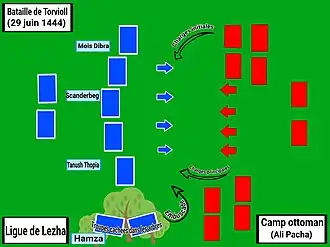 On the morning of 29 June,[5] Skanderbeg's army was divided into three parts and proceeded to feign a retreat, whilst 3,000 cavalrymen were hidden in a forest behind Ottoman forces under the command of Hamza Kastrioti. The Ottomans were drawn into the gorge of Torvioll as Skanderbeg and his men dispersed into the surrounding mountains and forests. Ali Pasha, confident that the Albanians had indeed retreated, prepared to declare his victory over Skanderbeg. However, unbeknownst to the Ottomans, the Albanians regrouped and eventually attacked the Ottomans deployed in the gorge. At some point, Skanderbeg gave Hamza and the hidden cavalry the signal to attack, and they surrounded the Ottoman forces and defeated them.[3][4][2]