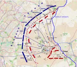Pichegru arrived on the scene the day after Tourcoing, and, oddly enough, received credit for the victory at the time. He now ordered an attack on the Coalition army at Tournai. Pichegru detailed Moreau's division to hold Courtrai and the line of the Lys River with the brigades of Dominique Vandamme and Philippe Joseph Malbrancq. These two units would keep Clerfayt from interfering with the operation. Moreau's third brigade under Nicolas Joseph Desenfans watched Ypres. Jan Willem de Winter's brigade from Souham's division would hold Helkijn (Helchin) and maintain the connection with Moreau.[17] Souham's division was ordered to attack the Coalition right (north) flank near Spiere and Leers while Bonnaud's division would assail the center near Templeuve. Osten's division was directed to demonstrate against the Coalition left (south) flank near Baisieux.[18]