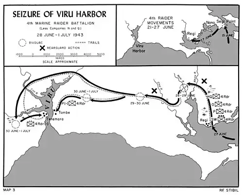 The Marines stopped short of the junction of the Tetemara–Tombe trails, close to their objective (Viru Harbor) on the evening of 30 June, and prepared to launch their attack the following day. Currin's men subsequently launched two-pronged attack the following morning; two platoons were detached to attack Tombe from the northeast, while the rest of the regiment skirted around the harbor to the north, crossing the Viru, Tita and Mango Rivers, and assaulted Tetemara from the southwest.[23] The outpost at Tombe was quickly overwhelmed around 08:45 on 1 July, while the main body of Marines drove the Japanese out of Viru in a running battle that lasted until the early afternoon. They were supported by preliminary air attacks by 17 US Navy Dauntless dive-bombers, while landing craft with combat supplies (ammunition and fuel) entered the harbor to ensure rapid resupply. As Hara's troops withdrew into the jungle, the Marines began constructing defensive positions to wait for reinforcement.[24][25]