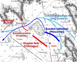 The Battle of Vyborg Bay (or the Battle of Vyborg)[e] was a naval battle fought between Russia and Sweden on 3 July 1790 in Vyborg Bay off the coast of Vyborg during the Russo-Swedish War (1788–1790). The Swedish Navy suffered heavy losses, losing seven ships of the line and three frigates, but Gustav III of Sweden eventually ensured a Swedish naval escape through a Russian naval blockade composed of units of the Baltic Fleet, commanded by Admiral Vasily Chichagov.[12] British historians would later call the Battle of Vyborg Bay the "Baltic Trafalgar".[2] The battle ranks among the world's largest historical naval battles and also among the most influential, as it introduced the naval battle concept of "firepower over mobility".