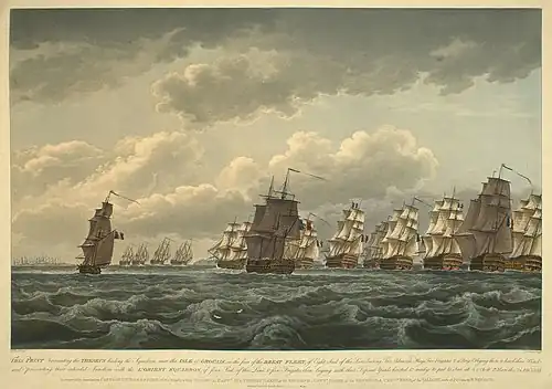 The blockade squadron off Lorient comprised the ships of the line HMS Theseus, HMS Triumph and HMS Valiant under Commodore John Beresford, watching three ships in the harbour under Contre-amiral Amable Troude.[4] At 15:15 Paget, who had lost sight of the French, reached the waters off Lorient and signalled a warning to Beresford. At 16:30, Beresford's squadron sighted Willaumez's fleet, tacking to the southeast. Willaumez ordered his second-in-command, Contre-amiral Antoine Louis de Gourdon to drive Beresford away and Gourdon brought four ships around to chase the British squadron, with the remainder of the French fleet following more distantly. Beresford turned away to the northwest, thus clearing the route to Lorient. His objective achieved, Gourdon rejoined Willaumez and the fleet sailed inshore, anchoring near the island of Groix.[7]