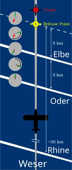 The "cross" signal in X-Gerät used a series of three very narrow single beams, Rhine, Oder and Elbe. They were carefully aimed to define a precise bomb release trajectory.[23] First a bomb release point along Weser was determined, by calculating the range or distance the bombs would travel between release and impact, and picking a point at that range to target. The Elbe beam intersected Weser 5 kilometres (3.1 mi) before the release point. The Oder beam intersected Weser 10 kilometres (6.2 mi) before the release point, or 5 kilometres (3.1 mi) before Elbe. Rhine did not require the same precision and was approximately 30 kilometres (18.6 mi) before the release point. The beams' width added a small error to the intersection coordinates, on the order of tens to hundreds of meters.
