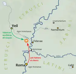 In 479 BC, the family of the Fabii offered to take the Roman responsibility for the war upon themselves, which the Roman senate accepted.[3] The Fabii built a camp on the Cremera, from which they harassed Veii and held back its raids on Rome.[4] The Fabii were successful in the fighting in 478 BC and 477 BC prior to the main battle which followed.[5]