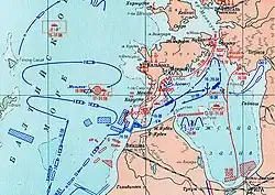 Four large, flat-bottomed barges loaded with German troops attempted to land at Pernau on 20 August, but were repelled by small Russian warships. The Russian gunboat Sivuch was destroyed in an engagement with the German light cruiser Augsburg and eight destroyers.[6]