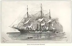 The flagship of the Union fleet occupying the Head of the Passes was the formidable USS Richmond. This vessel, a screw sloop with a ship rig, displaced 2,700 tons and mounted seven Dahlgren 9-inch smooth bores to a side and one rifled gun as a stern pivot. She also remounted one of her broadside guns as a bow pivot gun after anchoring by the lighthouse at the Head of Passes. Manned by an experienced crew of 260 well trained sailors, she was a behemoth compared to any vessel of the mosquito fleet.[10]: 38 Each of the Dahlgren guns weighed 9,020 pounds and was 9 feet long. One broadside from the Richmond carried more firepower than could be mustered by the entire Rebel fleet. Each 73.5 pound exploding shell would wreak havoc on a cotton clad vessel.[11]: 204 Supporting the Richmond were the Vincennes and Preble. Each ship mounted 14 and 16 32-pounder smooth bores respectively, and were sloops of war with no power other than sail. The Vincennes also mounted a 9-inch smooth bore as a bow pivot gun. This was one of the guns intended for the shore battery at the lighthouse. Supporting the sail sloops was the Water Witch, a side-wheel steam powered gunboat mounting one 32-pound smoothbore and one rifled 12-pound howitzer. The Water Witch was to provide towing capacity for the sail vessels under unfavorable wind conditions.[12][13][14]