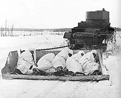 In World War II, the Soviet Union used armored battle sleds in Winter War in winter battles in the Karelian Isthmus against Finland. The sleds were smaller with one line of infantry behind an armored plate towed by a tank. The armored sleds carrying infantrymen helped to resolve the problem of deep snow slowing down the foot soldiers.[3]