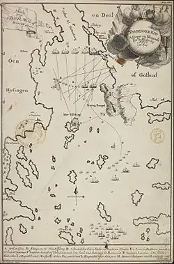 On March 27, 1719, a Dano-Norwegian naval force, consisting of four ships of the line and a frigate, anchored in Rivö bay outside of Gothenburg. The blockading force was under the command of Tordenskjold, who had recently been promoted to the lower admiral rank of schout-bij-nacht. To avoid endangering the peace conference that was taking place in Stockholm in the spring, Tordenskjold had been ordered not to assault Gothenburg.[31] In early June, the blockading naval force had increased to seven ships of the line, two frigates, four barges, two floating batteries, one bombarderskip, five galleys and two galiots. The smaller Danish vessels attempted to halt Swedish naval traffic between Nordre river and Marstrand. In mid-June, an additional 26 Danish merchant ships arrived from Öresund with storage for the Danish blockading fleet.[32]
