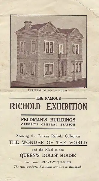 The dolls' house was then loaned to the Richold Collection, which by 1931 was owned jointly by "Mr. W. H. Todd, a native of Leeds, and Mr. H. Bell of Sheffield".[13] Batty was paid a percentage of the monies earned from exhibiting his dolls' house alongside the Richold models.[14] This arrangement continued for some time until the dolls' house was eventually given to the owner of the Richold collection by a relative of Batty.[14]